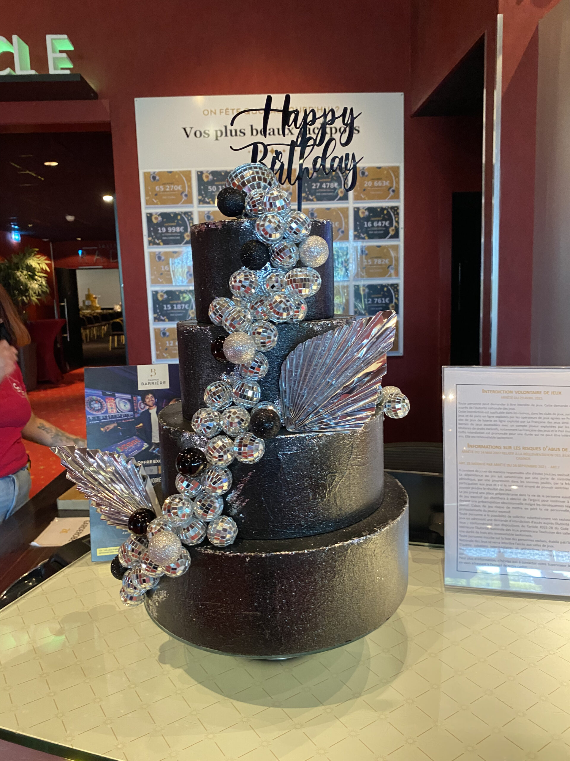 Le premier, un gâteau géant, est couvert de boules à facettes, de sphères dorées et d’éléments lumineux. Le deuxième, plus petit, mais tout aussi stylé, accueille les invités dès l’entrée.