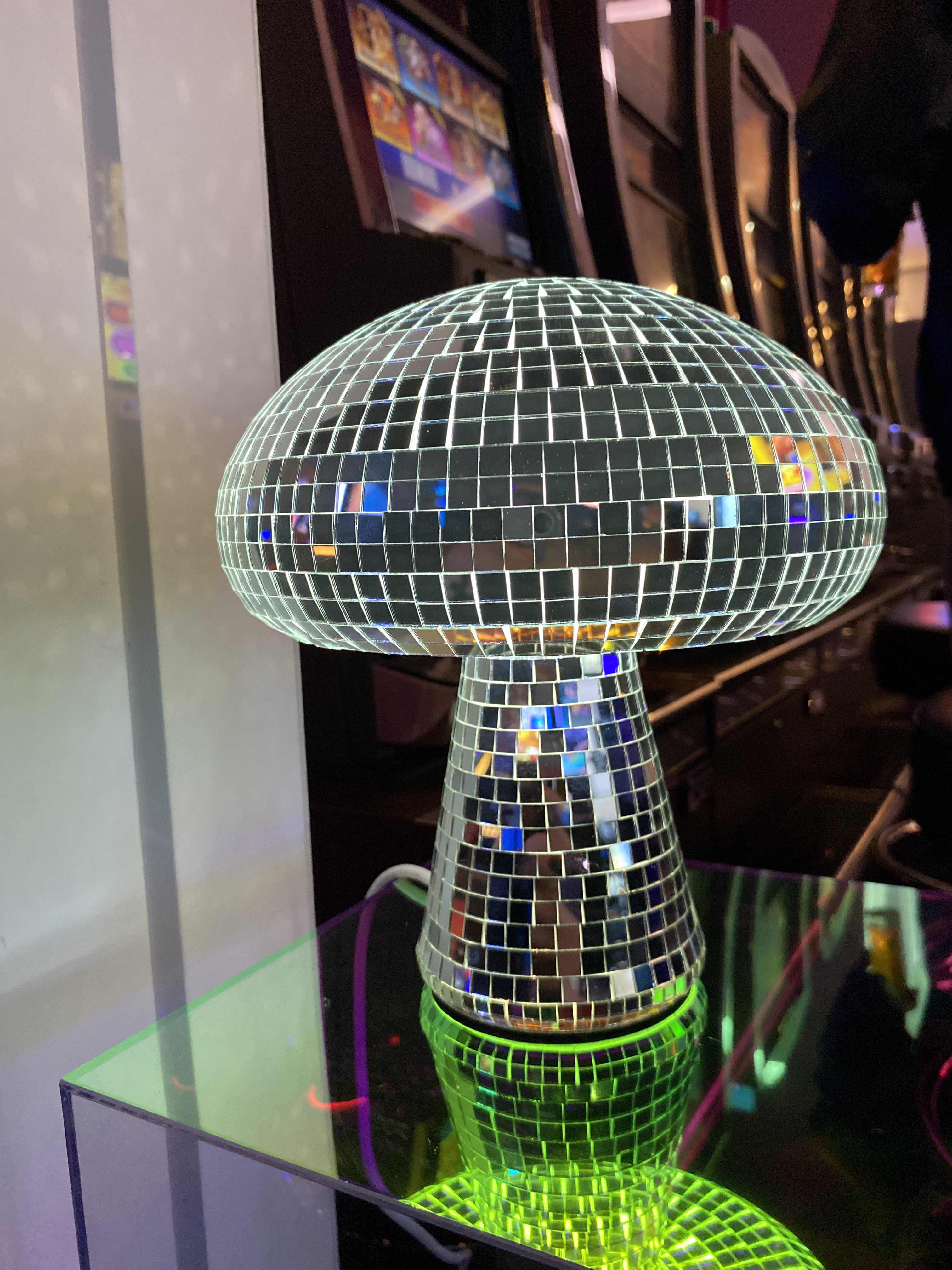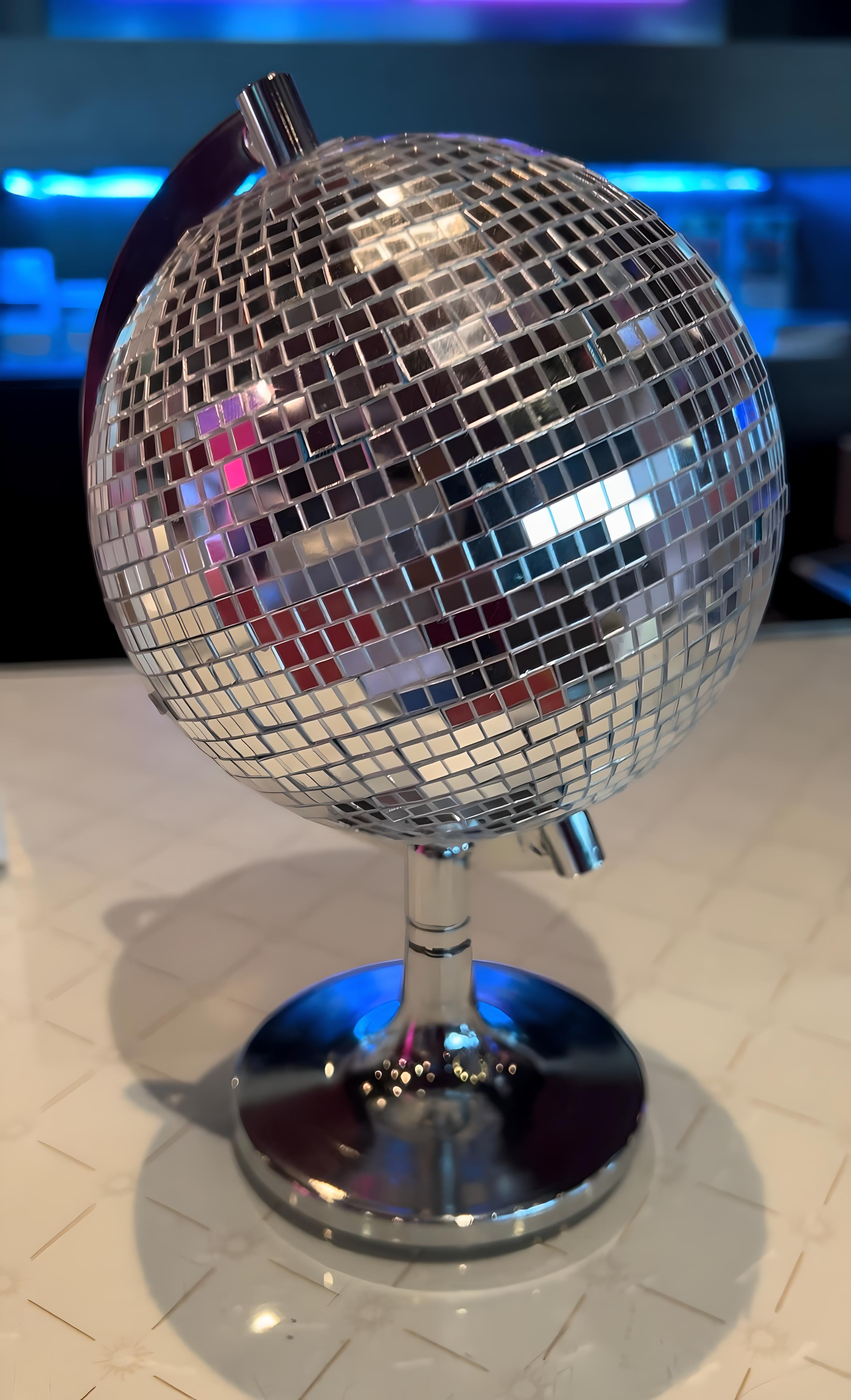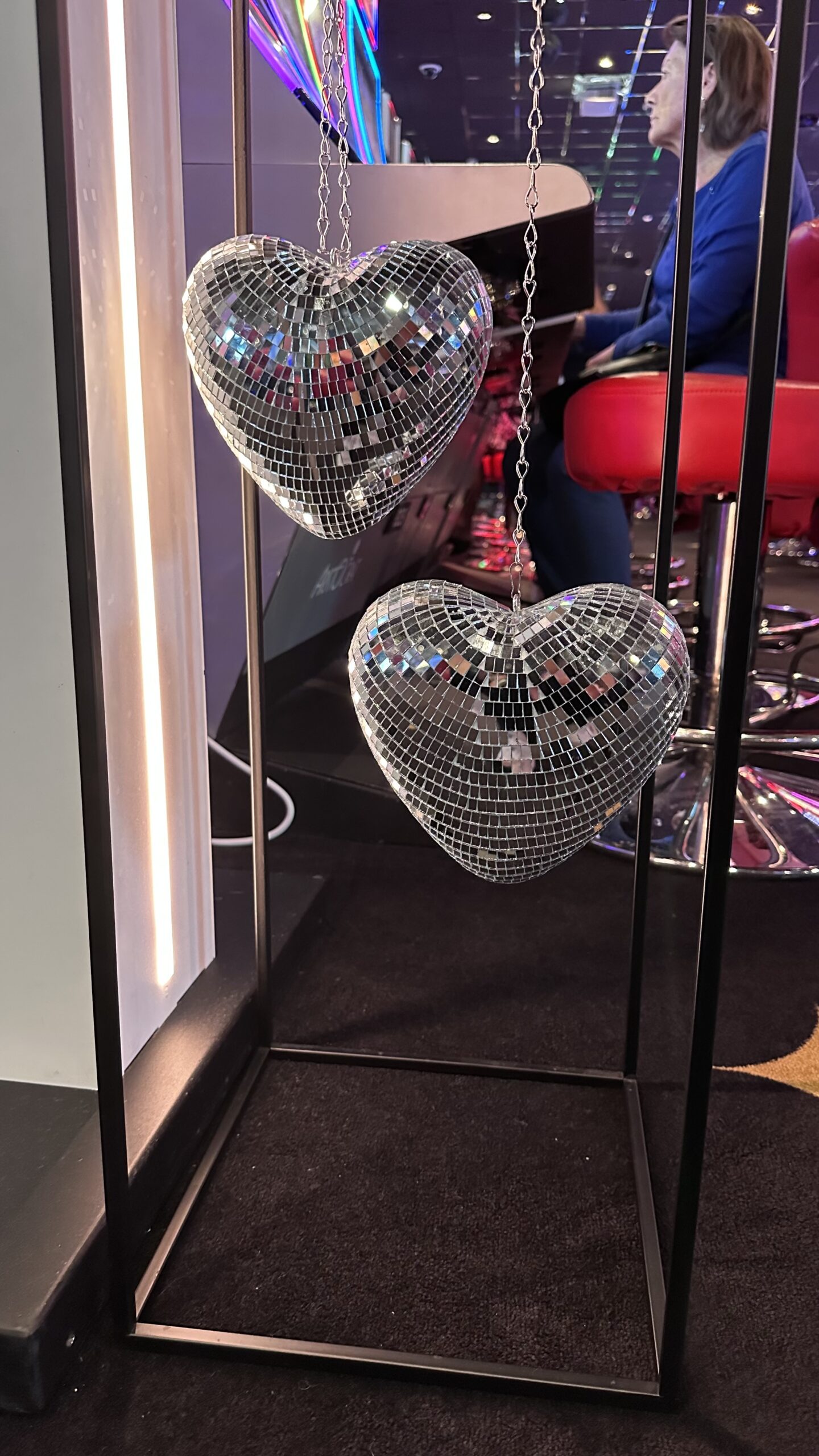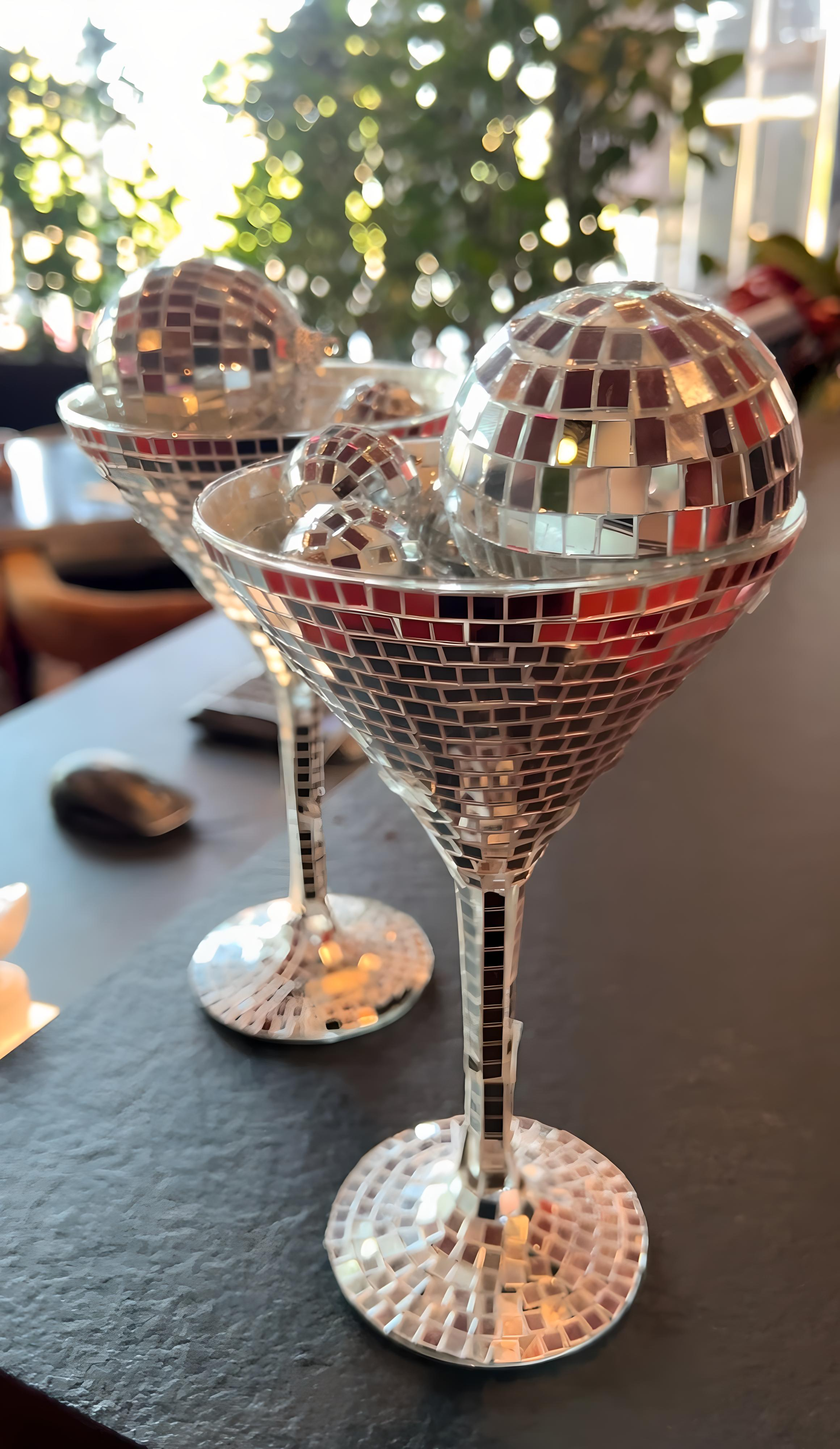 Pour structurer l’espace, on a collaboré avec nos partenaires alsaciens pour créer des vitrines personnalisées. Adaptables à d’autres thèmes (parce qu’on pense toujours à tout), elles mettent en valeur les boules à facettes sous leur meilleur jour. D’ailleurs, certaines sont suspendues, d’autres sont placées dans des colonnes transparentes ou des vases en verre.